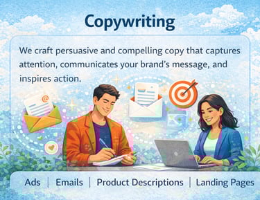 We craft persuasive and compelling copy that captures attention, communicates your brand’s message, and inspires action. From ads and emails to product descriptions and landing pages, our words help your business convert and grow.